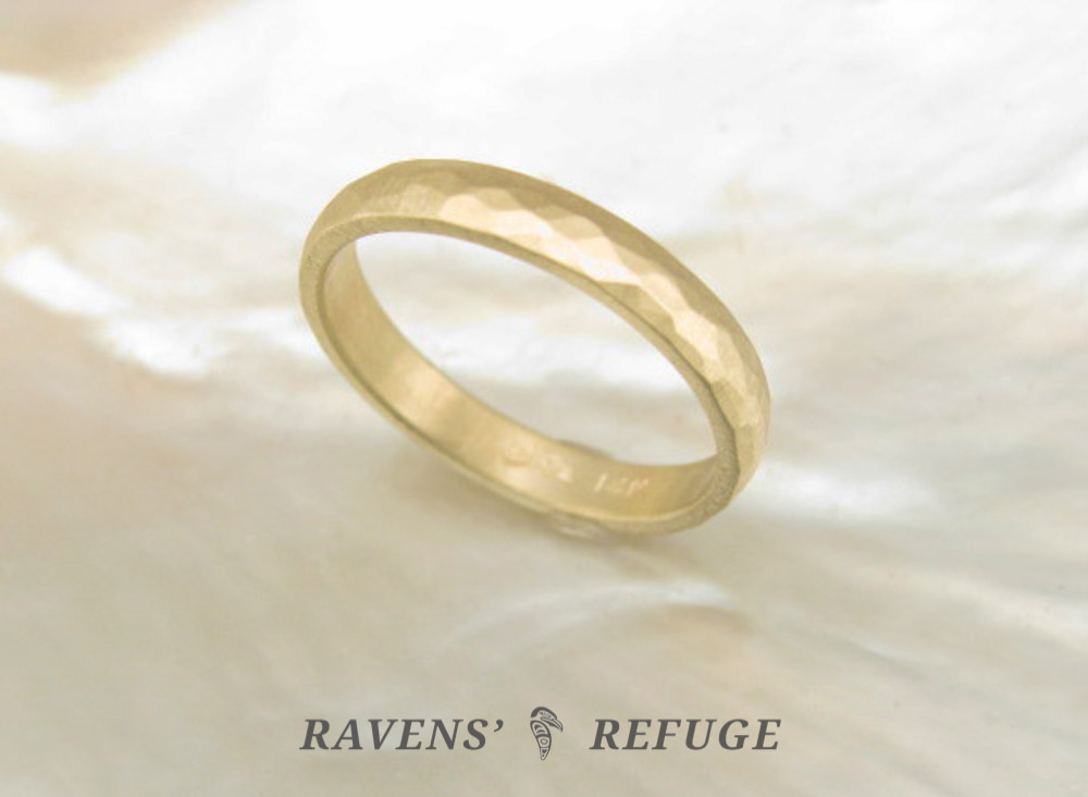 The leaf hammering style is our most textured hammering style at this time, with hundreds of tiny *pings* of the hammer. Its facets are small and round. This style works well with both domed and flat bands, and is an excellent texture for a person who works extensively with his or her hands. We recommend a satin finish for the leaf style.