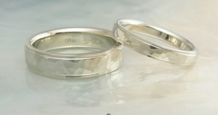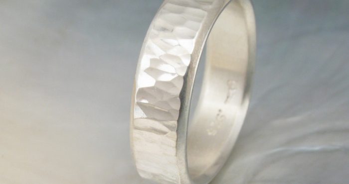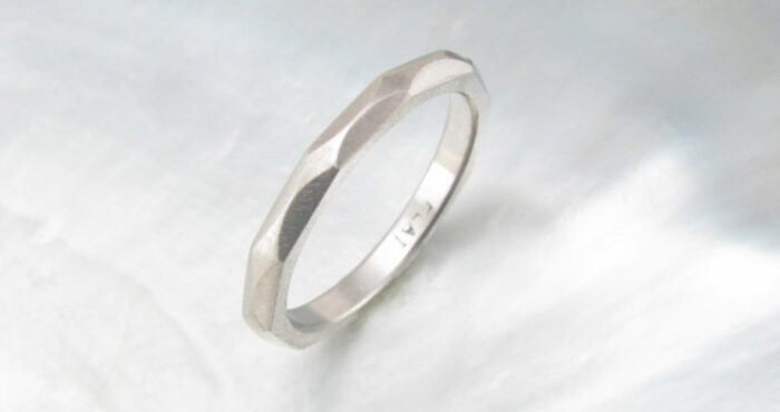 The “forged” style is hammered only in the sense that the hammer is used to shape the band into its present form. The effect is a natural and organic aesthetic. These facets are quite large, and they lend subtle drama and quiet strength to wider bands. On narrower bands, the “forged” facets offer a rustic effect.
