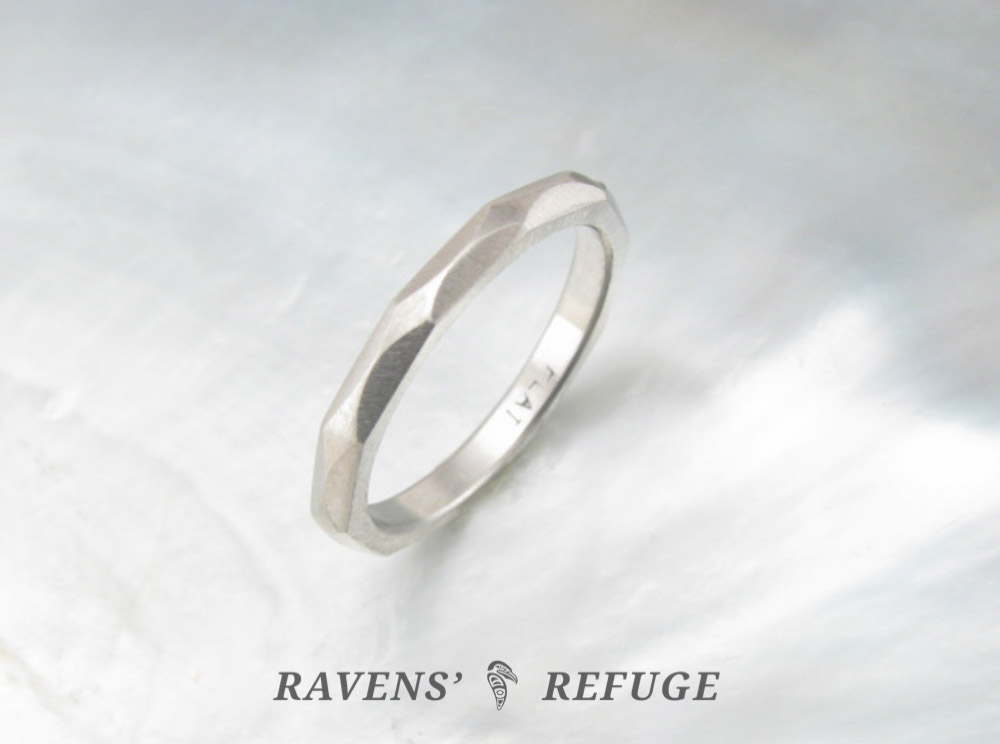 Our faceted bands are textured by means of hand filing rather than hammering. In the examples shown, a controlled manner of filing was used for the smaller band, while a random filing was employed on the larger bands. The random filing can be utilized to create a warped effect, whereby the light shifts across the band, never settling.