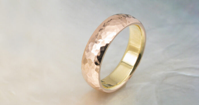 The honeycomb hammering style is more textured than most of our other hammering styles. The facets, somewhat deep and angular in form, almost seem to drip with molten metal. This style works best with softer metals such as rose gold and the higher karats of yellow gold. It also looks great on platinum, though not quite as “drippy.”