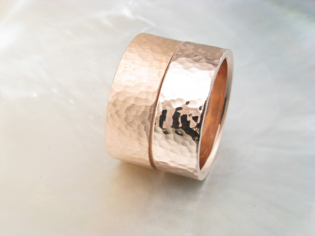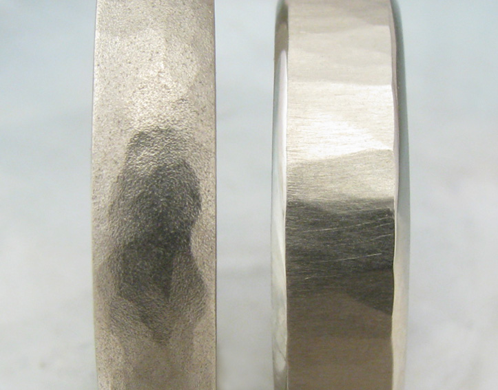 The photo to the right shows two bands made of 14k rose gold and hammered with our “pebble” hammering style. The band on the left has a satin finish, while the band on the right is polished. The satin finish is more muted, while the polished finish has been buffed to a high shine with the aid of polishing compounds.